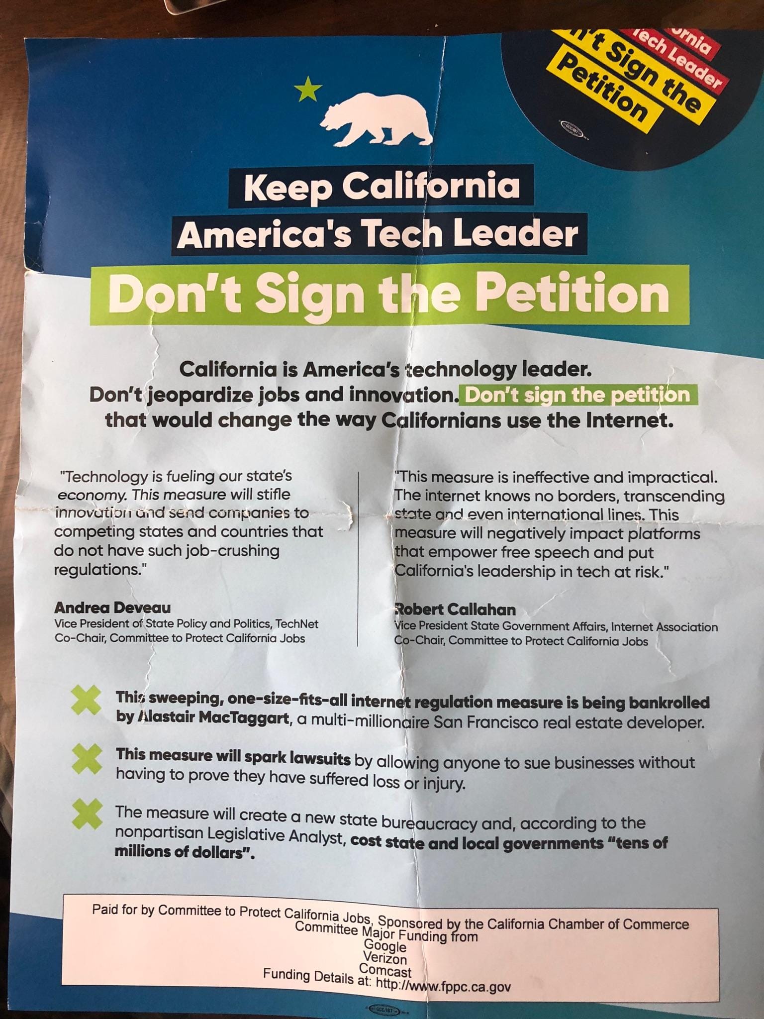 TECH GIANTS FIRES BACKGoogle, Verizon, Comcast and other high tech giants are funding their campaign to the tune of what some estimates say could be as high as $100 million."Keep California America's Tech Leader" is the name of the group opposed to the privacy initiative. A handout from the group expressly asks voters not to sign the Consumer Privacy Act Initiative.Co-Chair Andrea Deveau is quoted, "Technology is fueling our state's economy. This measure will stifle innovation and send companies to competing states and countries that do not have such job-crushing regulations."The group states the Consumer Privacy Act will also spark lawsuits by allowing anyone to sue businesses without having to prove they have suffered loss or injury.For a complete list of the firms funding the effort visit: fppc.ca.gov