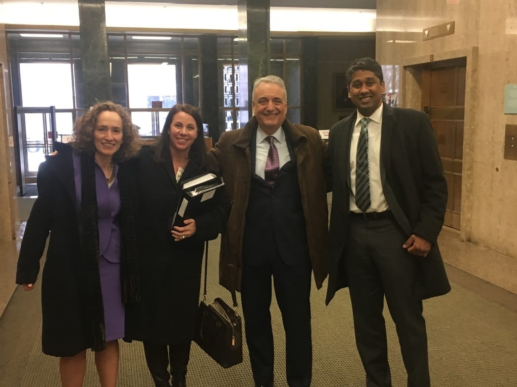 Level the Playing Field's legal team, including lead attorney Alexandra Shapiro (far left), LPF Executive Director Cara McCormick (middle), LPF CEO Peter Ackerman (middle), and attorney Chetan Patil (far right).