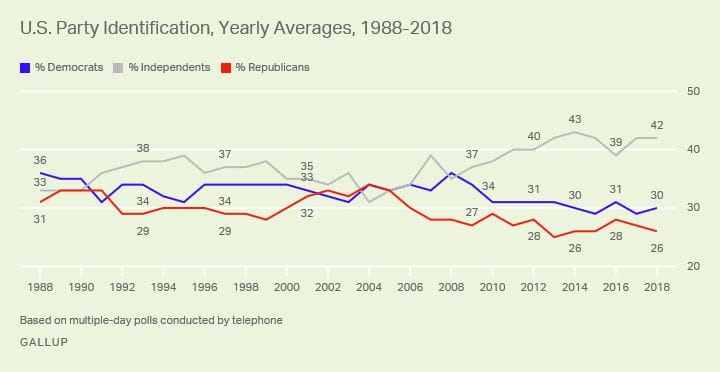 Americans continue to be more likely to identify as politically independent than with the Republican and Democratic parties. Gallup has continued to track this trend, with independents hovering over 40% of the voting population
