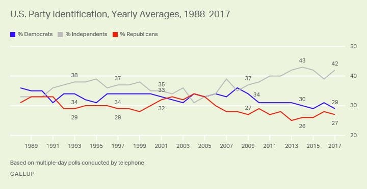 No wonder then that Iowa's voter affiliations track rather closely with the nation's as well. According to a Gallup study published in January of this year, the nation's independent voters in 2017 were up to 42 percent of registered voters in 2017, from 39 percent in the preceding year. (We're just getting started.)