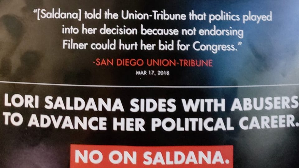 This piece by the San Diego Democratic Party reads, candidate "Lori Saldaña sides with abusers to advance her political career."