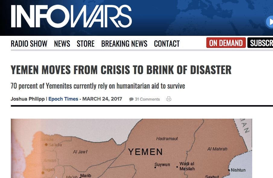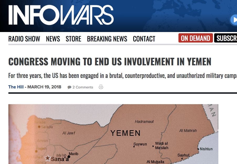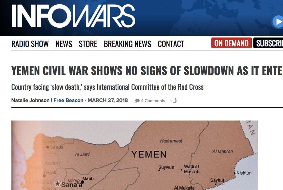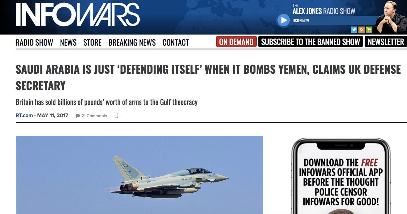 And in a twist of irony that elevates this context from surreal to a state of absurdity beyond all comprehension, while the mainstream media continues its blackout of this U.S.-backed violent humanitarian crisis in Yemen, which reached a fever pitch the same week Alex Jones was de-platformed for "glorifying violence" and "dehumanizing language" against Muslims, it turns out that Alex Jones' InfoWars has been one of the most outspoken and vocal critics of the intervention in Yemen(!).