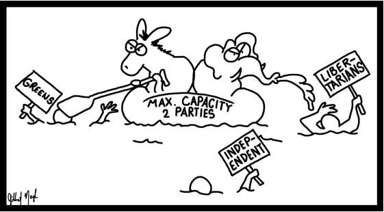 Here in the U.S., our two-party duopoly has sidelined approximately 42% of us — we identify as independents rather than with either party. Meanwhile, the 2016 presidential race is Exhibit A that all of us have to live with the product of these two parties and the country-club rules by which they choose the two candidates that end up our only real choices in November.