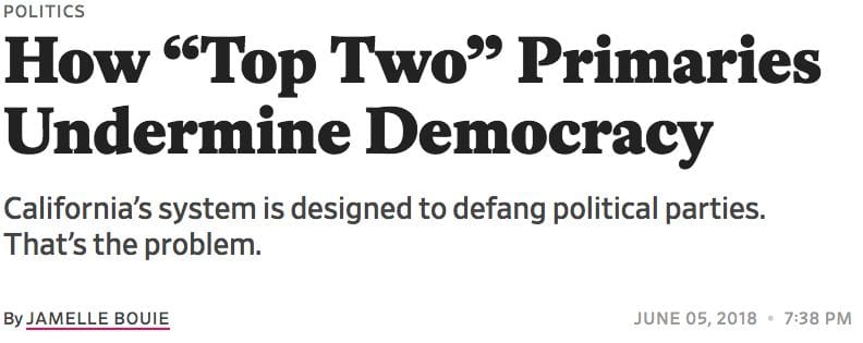 Here's the sad truth. Jamelle seems like a smart, well-read, and political savvy journalist. But he sees the world through a partisan lens, unable to witness the political world in the way independent-minded voters do. That's the state of politics. For party leaders, pundits, and partisan journalists, the argument over top-two is about strengthening the democratic process so THEIR party wins. After all, don't we all think we know what is best for democracy?