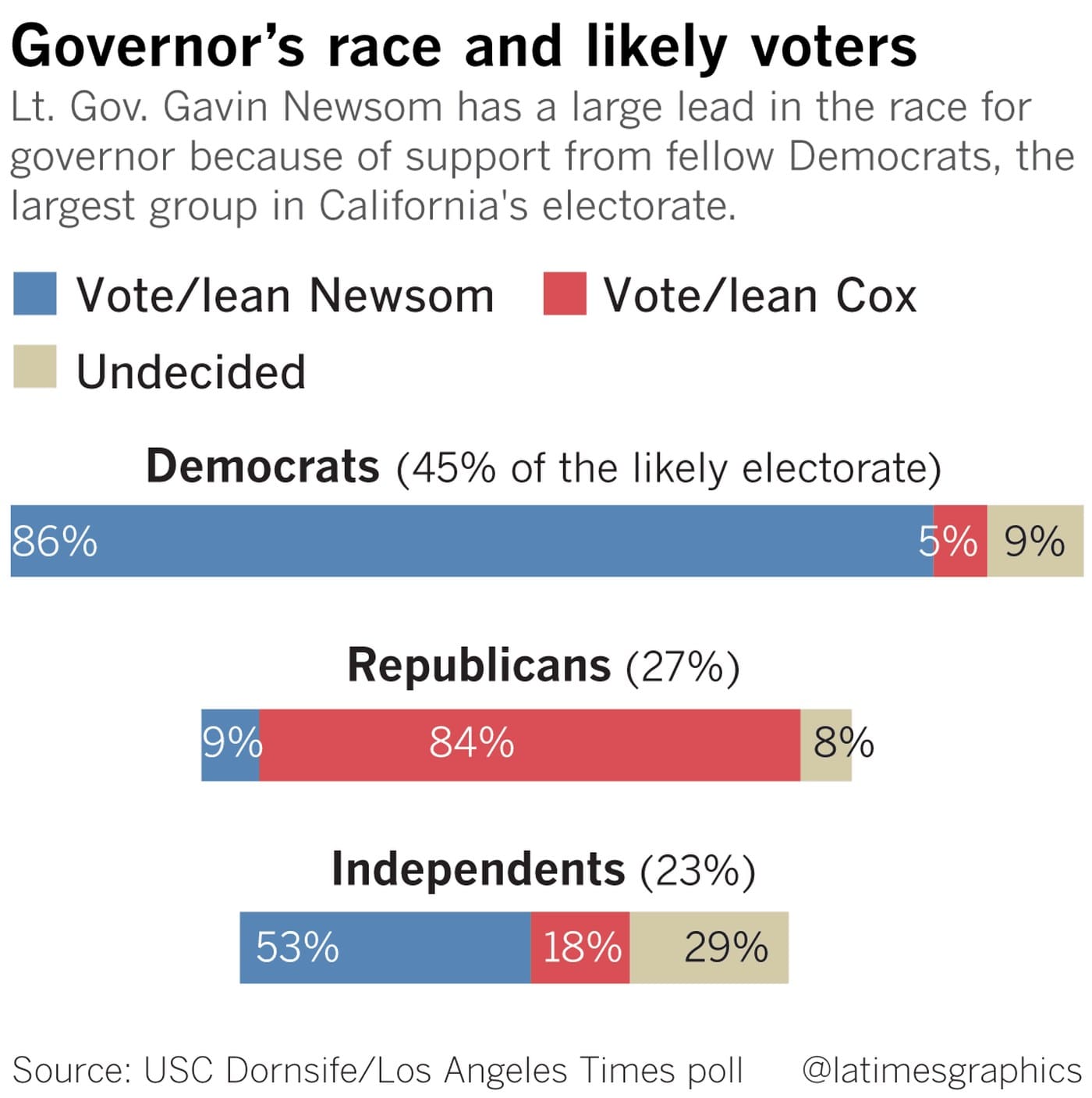 On Wednesday, the same day it endorsed Newsom, the Los Angeles Times published the results of a survey it conducted with USC Dornsife, which found "54% of likely voters in the state favored Newsom for governor compared to 31% who support Cox. The remainder were undecided."