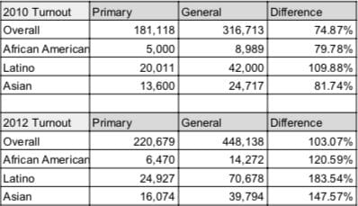 While voter turnout among the general electorate usually increases about 80 - 100% for the November general election compared to the June primary, the difference in turnout among minorities is particularly telling with respect to the disparate impact the 50%+1 rule has on minorities.