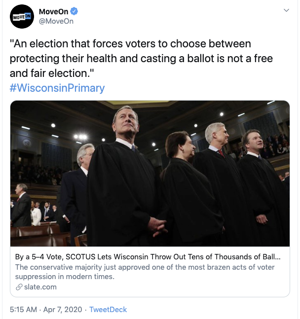 Justice Ruth Bader Ginsburg called the majority’s decision “ill advised” in a dissent joined by Justices Sonia Sotomayor, Stephen Breyer and Elena Kagan. “While I do not doubt the good faith of my colleagues, the Court’s order, I fear, will result in massive disenfranchisement,” Ginsburg wrote. “A voter cannot deliver for postmarking a ballot she has not received. Yet tens of thousands of voters who timely requested ballots are unlikely to receive them by April 7, the Court’s postmark deadline.”