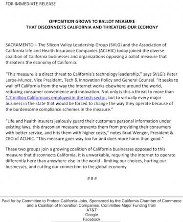 In the release, the Silicon Valley Leadership Group (SVLG) and the Association of California Life and Health Insurance Companies (ACLHIC) write the Privacy Act "threatens the economy of California."