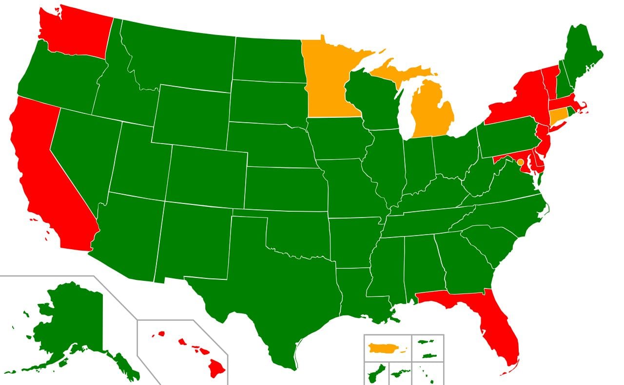Green: Bump stocks legal || Yellow: Legality unclear || Red: Bump stocks illegal