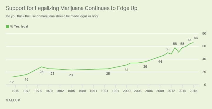 According to the latest Gallup poll, 66% of Americans now support legalizing marijuana. That's a new record high in an upward trend of support for marijuana legalization since Gallup began putting the question to survey takers a half century ago.